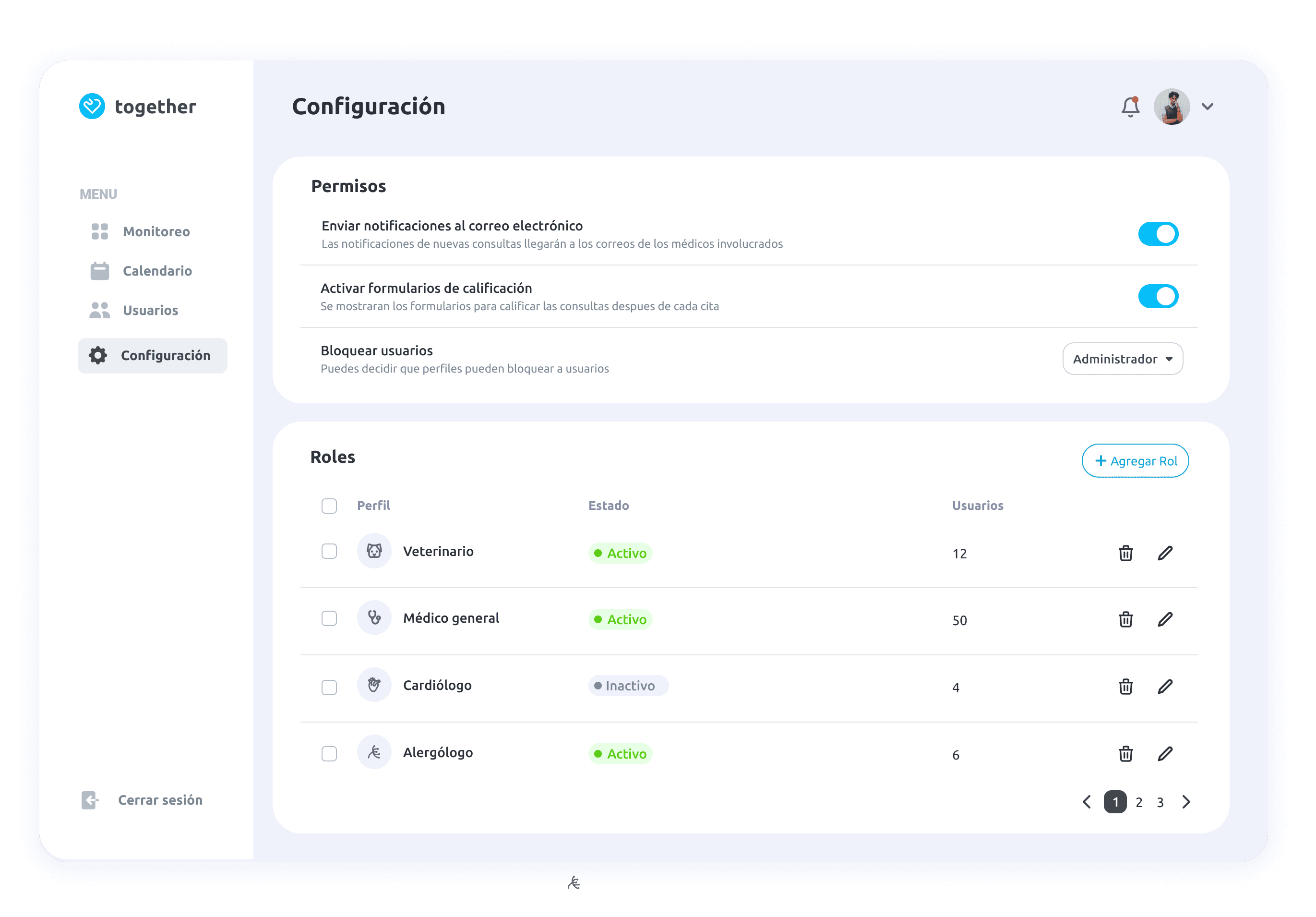 Sección de "Roles": asignar roles específicos a diferentes usuarios o grupos de usuarios, como médicos, administradores, personal de atención al paciente, etc. Cada rol puede tener diferentes niveles de acceso y autorización para realizar acciones dentro de la plataforma.