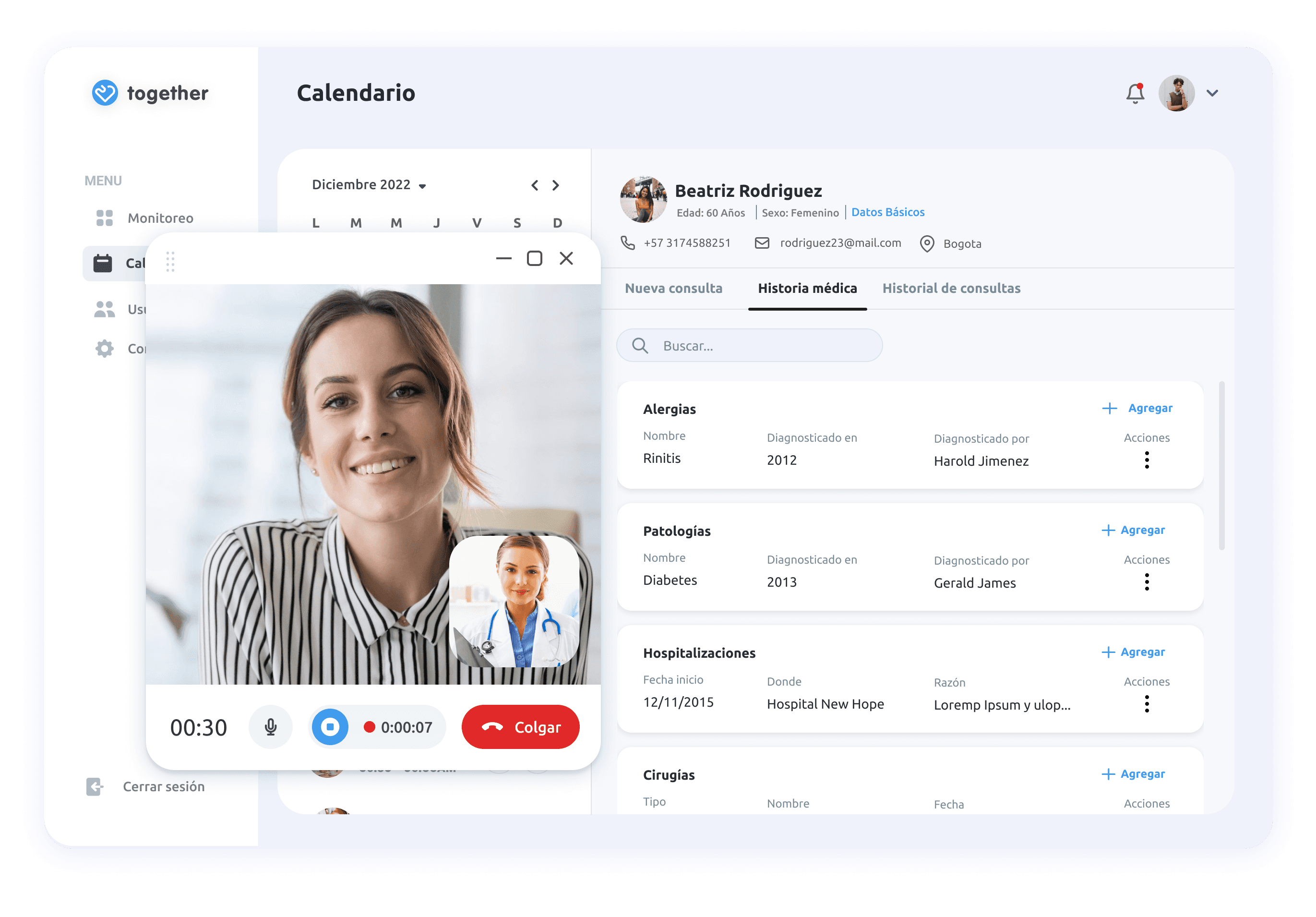 Brinda la posibilidad de integrar datos de dispositivos médicos como monitores de presión arterial, glucómetros, etc., para un seguimiento más completo de la salud del paciente, así como un sistema de alertas que notifiquen en tiempo real al médico cualquier emergencia.