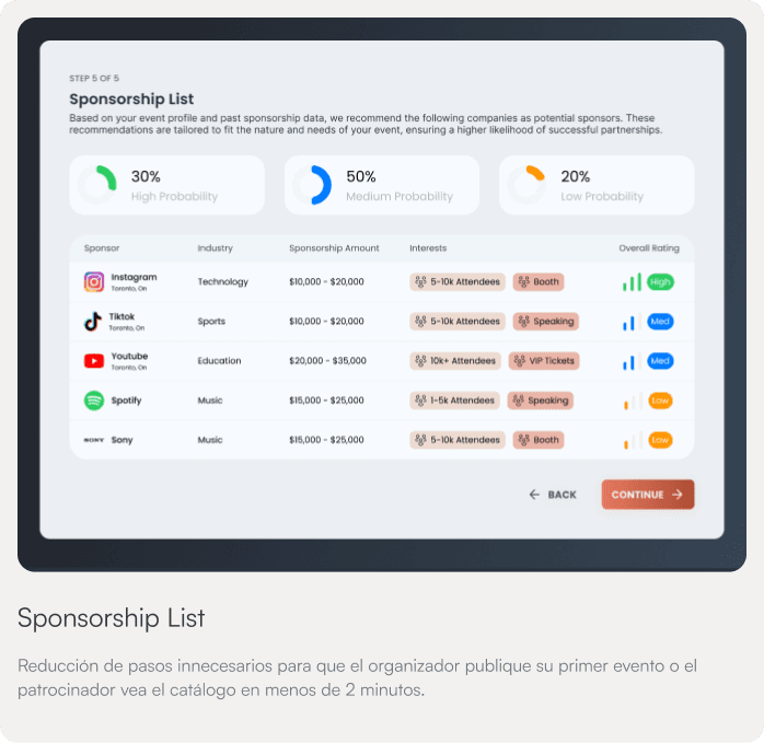 Reducción de pasos innecesarios para que el organizador publique su primer evento o el patrocinador vea el catálogo en menos de 2 minutos.