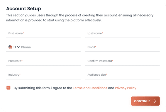 Flujo de registro optimizado para capturar datos clave (ubicación, sector y tamaño de audiencia) sin abrumar al usuario.