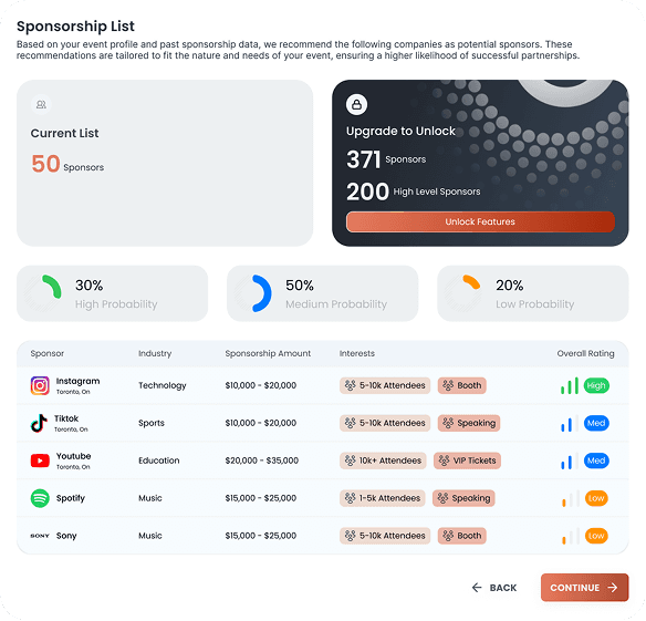 Detectamos que los organizadores perdían oportunidades por procesos de negociación opacos, mientras los patrocinadores carecían de herramientas de segmentación por nicho y ubicación. Este hallazgo transformó el alcance del proyecto: dejamos de diseñar una simple interfaz para construir una plataforma de inteligencia de datos que valida financieramente cada inversión.